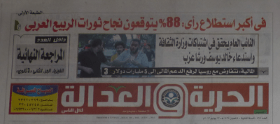 L’administration de MISR ayant fait savoir à mes avocats qu’elle était prête à une conciliation, je ne me suis plus représenté à l’établissement qu’épisodiquement pendant les jours suivants, mais lorsque la rencontre prévue fut annulée au dernier moment par la partie adverse, je compris qu’il ne s’agissait de leur part que d’une nouvelle manœuvre dilatoire visant à venir à bout de mes ressources et de ma volonté, et à se rapprocher de la fin de l’année scolaire. J’étais en effet dans une situation très difficile, n’ayant plus touché de salaire depuis février, et ayant engagé des frais judiciaires conséquents. Je ne survivais que grâce à des cours particuliers, notamment avec mes anciens élèves, dont les parents me soutenaient ainsi, et à des emprunts à mes proches qui m’envoyaient de l’argent depuis la France. Mais voyant que je ne parviendrais à rien, j’ai décidé de rendre cette affaire publique, et j’ai sollicité pour cela le journal de la Présidence de la République d’alors, La Liberté et la justice, qui publia un article sur moi dans son édition du 13 juin 2013[45]. Ce jour-là, ayant acquis nombre de copies de ce journal, je me suis rendu à l’école peu avant la sortie des cours, afin de le distribuer aux parents et personnels (un seul enseignant me salua et prit ce journal, et tous les autres détournèrent pudiquement les yeux). J’avais demandé à un ami égyptien de venir, et de me prendre en photographie avec le journal devant l’établissement afin de republier cette photo dans un nouvel article le cas échéant et du moins de pouvoir garder une trace indéniable de mon action, qui était constamment falsifiée depuis des mois – et qui le sera encore de manière spectaculaire par Frédéric TUMPICH pour cet incident, prouvant que cette précaution n’était pas vaine. Nous avions prévu qu’en cas de réaction violente de MISR, aucune résistance ne serait opposée et qu’il faudrait simplement quitter les lieux, quoi qu’il advienne.