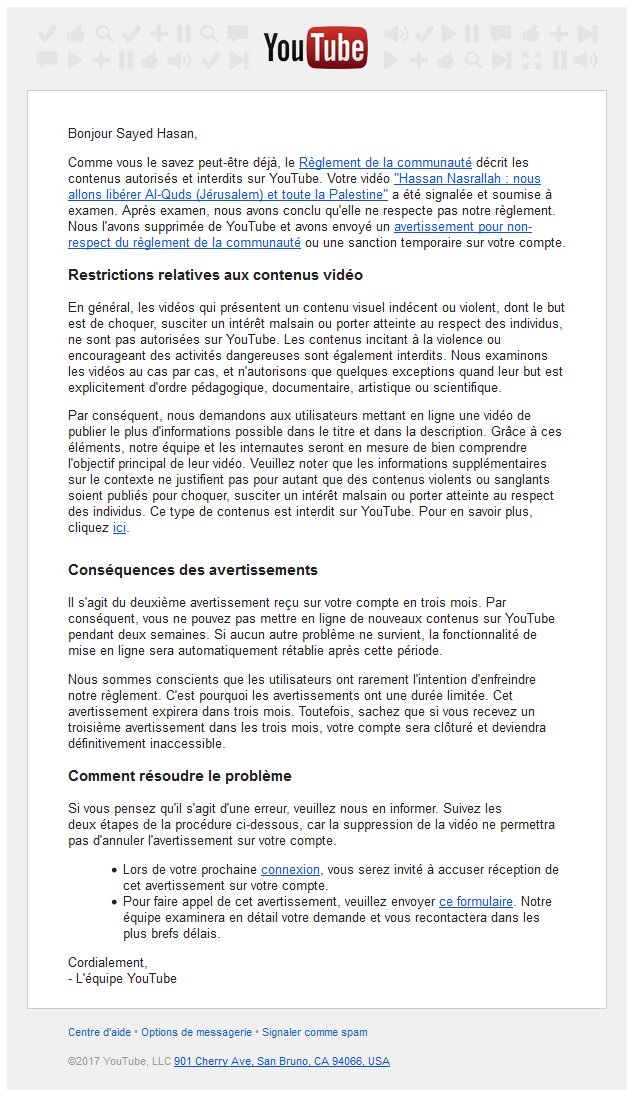 Je vous écris pour protester contre la suppression d’une vidéo sur Youtube (https://www.youtube.com/watch?v=HoPAu9-gVSk) le 14 décembre 2017, au prétexte d’un « non-respect des règles concernant le contenu violent ou choquant de YouTube », dont la transcription peut être retrouvée ici : http://sayed7asan.blogspot.fr/2017/12/hassan-nasrallah-nous-allons-liberer-al.html