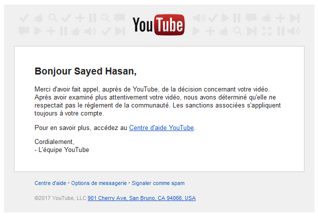 J’ai immédiatement effectué cet appel, mais en vain, ma contestation ayant été rejetée en 12h (voir ci-dessous). Je l’avais également fait pour une autre vidéo qui m’a valu un premier avertissement en octobre (sa transcription est disponible ici : Daech est l’allié d’Israël et vise La Mecque et Médine), mais après bientôt deux mois, je n’ai toujours pas reçu de réponse.