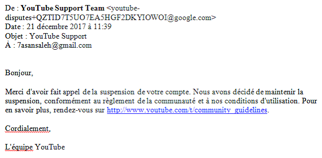 Il faut préciser, au crédit de Youtube, qu’une procédure d’appel existe également contre la suppression d’une chaîne, et cette fois-ci, ce ne sont pas 200 mais bien 1000 caractères qui sont autorisés, soit environ 120 mots. Cela peut paraître léger pour un travail de plusieurs années (voire le travail d’une vie), complètement détruit en quelques clics par Google, mais légaliste jusqu’au bout, j’ai effectué cette pseudo-procédure le jour même. La réponse n’a pas tardé – au crédit de Youtube, citons encore ce temps judiciaire particulièrement expéditif et récurrent : 12 heures, contre plusieurs années pour la justice traditionnelle. Il semble évident que les procédures d’appels sont systématiquement rejetées par un mail-type envoyé automatiquement au bout de 12 heures. Cette réponse mérite d’être citée intégralement, sa brièveté s’y prêtant volontiers :