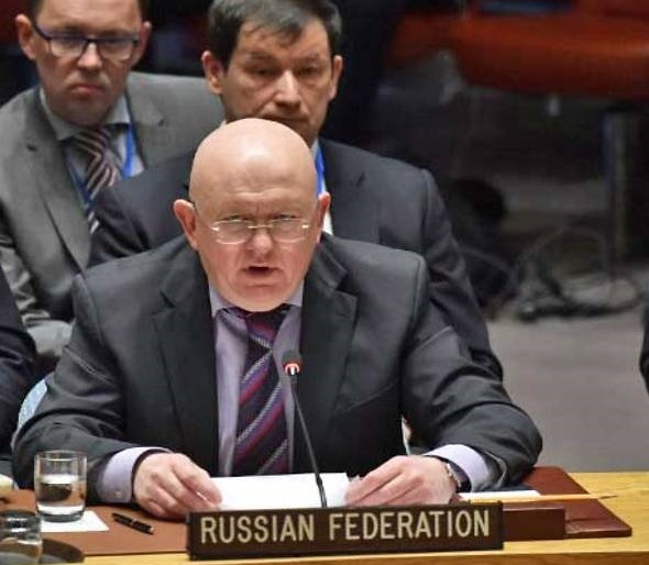L’ambassadeur russe auprès des Nations Unies, Vassily Nebenzia, s’est adressé au Conseil de sécurité le 9 avril 2018, à propos d’une attaque chimique présumée à Douma, dans la banlieue de Damas.