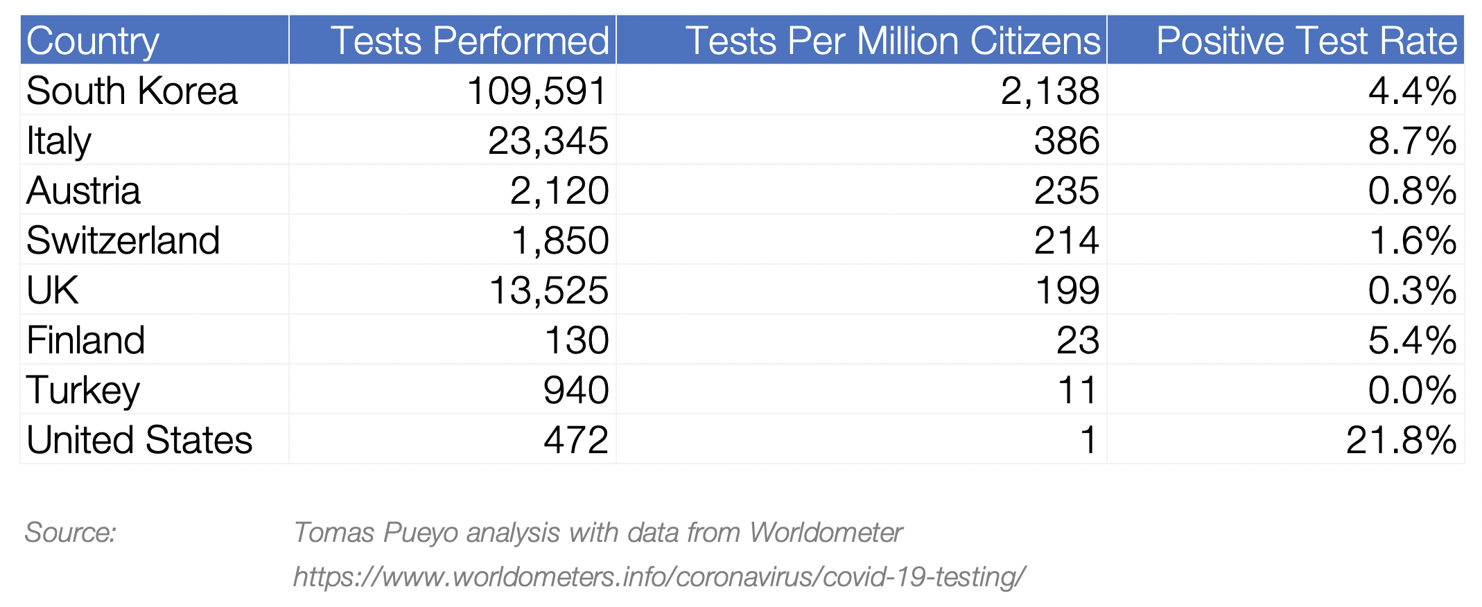 La Turquie, sans cas de coronavirus, a subi 10 fois plus de tests par habitant que les États-Unis. La situation n’est pas beaucoup meilleure aujourd’hui, avec environ ~8 000 tests effectués aux États-Unis, ce qui signifie que ~4 000 personnes ont été testées (le nombre de tests équivaut au nombre de prélèvements réalisés, et il y en a 2 à 3 par personne).
