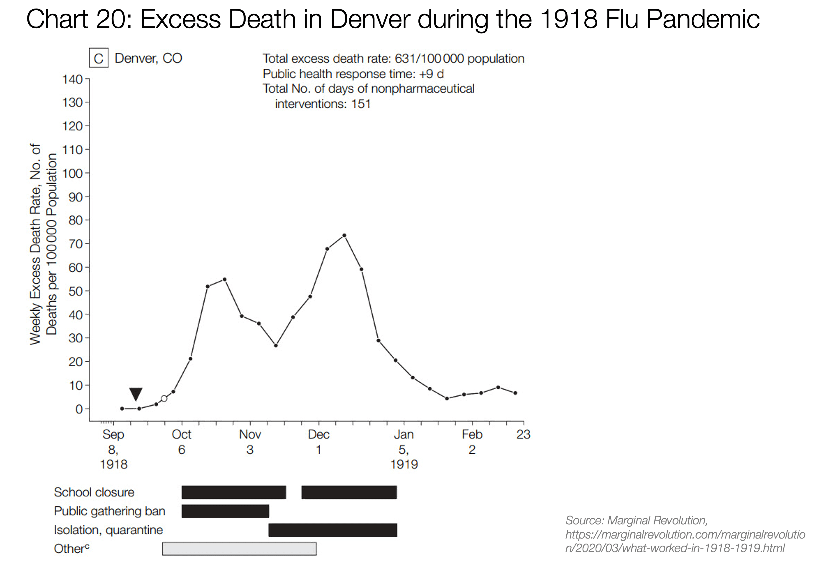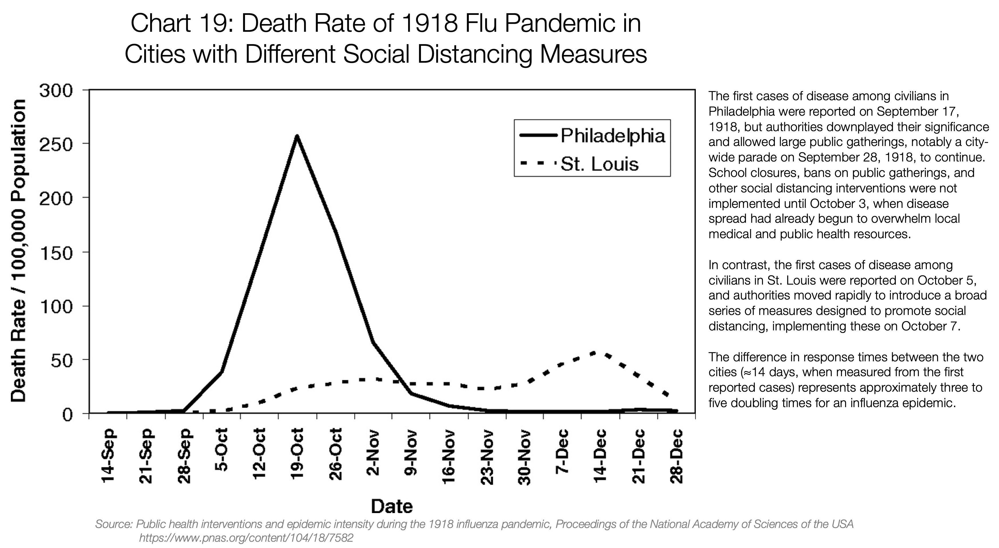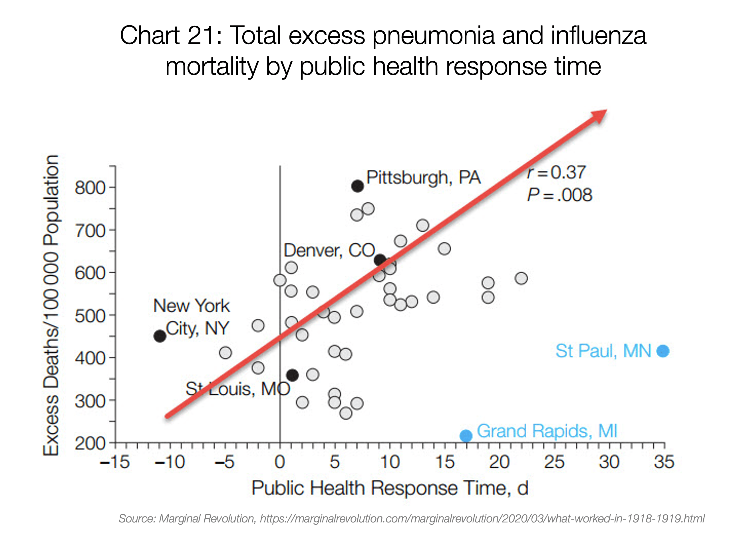 Ce graphique montre, pour la pandémie de grippe de 1918 aux États-Unis, le nombre de décès supplémentaires par ville en fonction de la rapidité des mesures prises. Par exemple, une ville comme St Louis a pris des mesures 6 jours avant Pittsburgh et a enregistré moins de la moitié des décès par habitant. En moyenne, prendre des mesures 20 jours plus tôt a réduit de moitié le taux de mortalité.