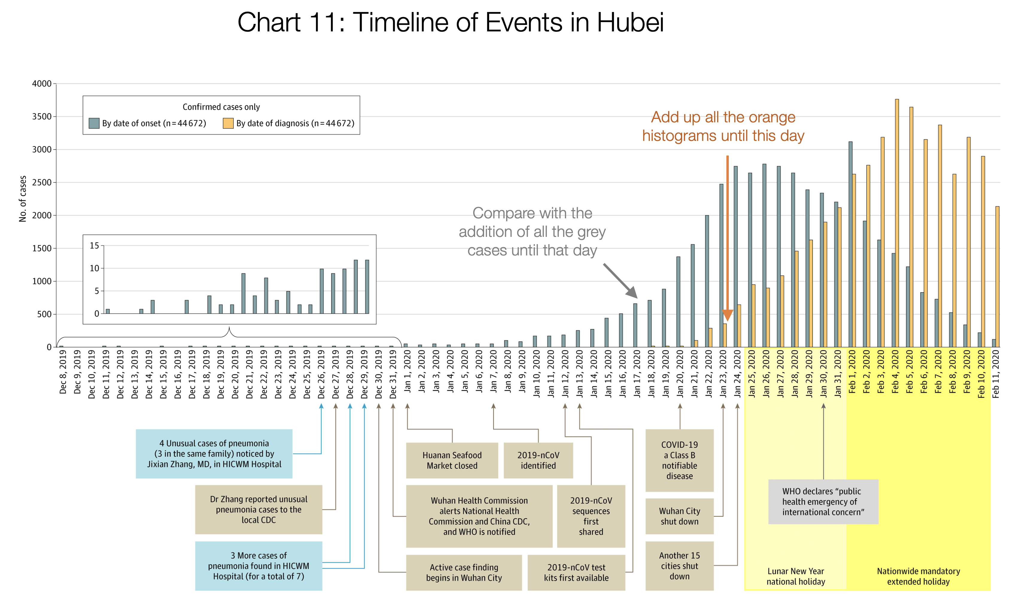 Le 21 janvier, le nombre de nouveaux cas diagnostiqués (orange) explose : il y a une centaine de nouveaux cas. En réalité, il y a eu 1 500 nouveaux cas ce jour-là, en croissance exponentielle. Mais les autorités ne le savaient pas. Ce qu’ils savaient, c’est que soudainement il y a eu 100 nouveaux cas de cette nouvelle maladie.