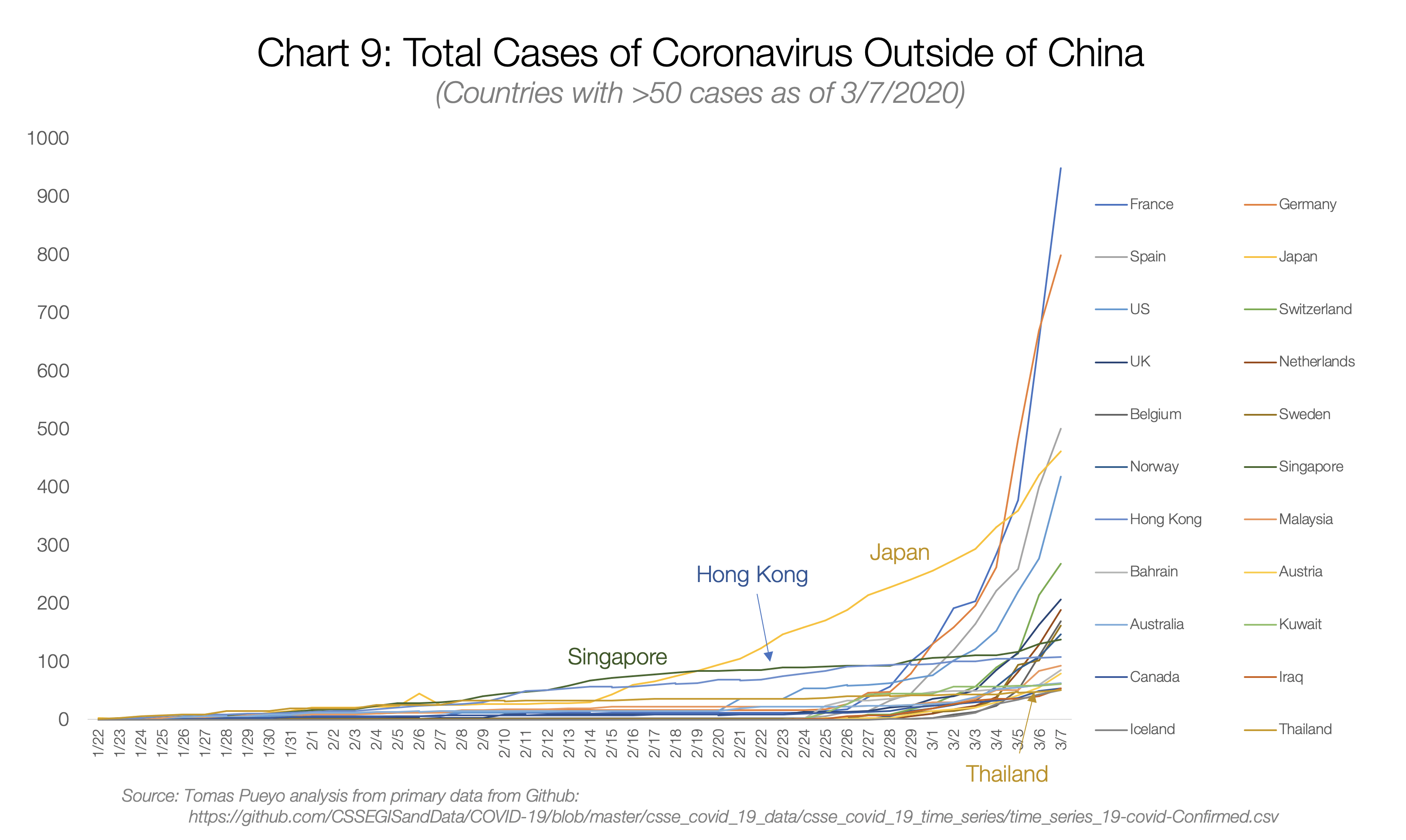 Le nombre total de cas a augmenté de façon exponentielle jusqu’à ce que la Chine le contienne. Mais ensuite, il y a eu une fuite du virus à l’extérieur, et maintenant c’est une pandémie que personne ne peut arrêter.