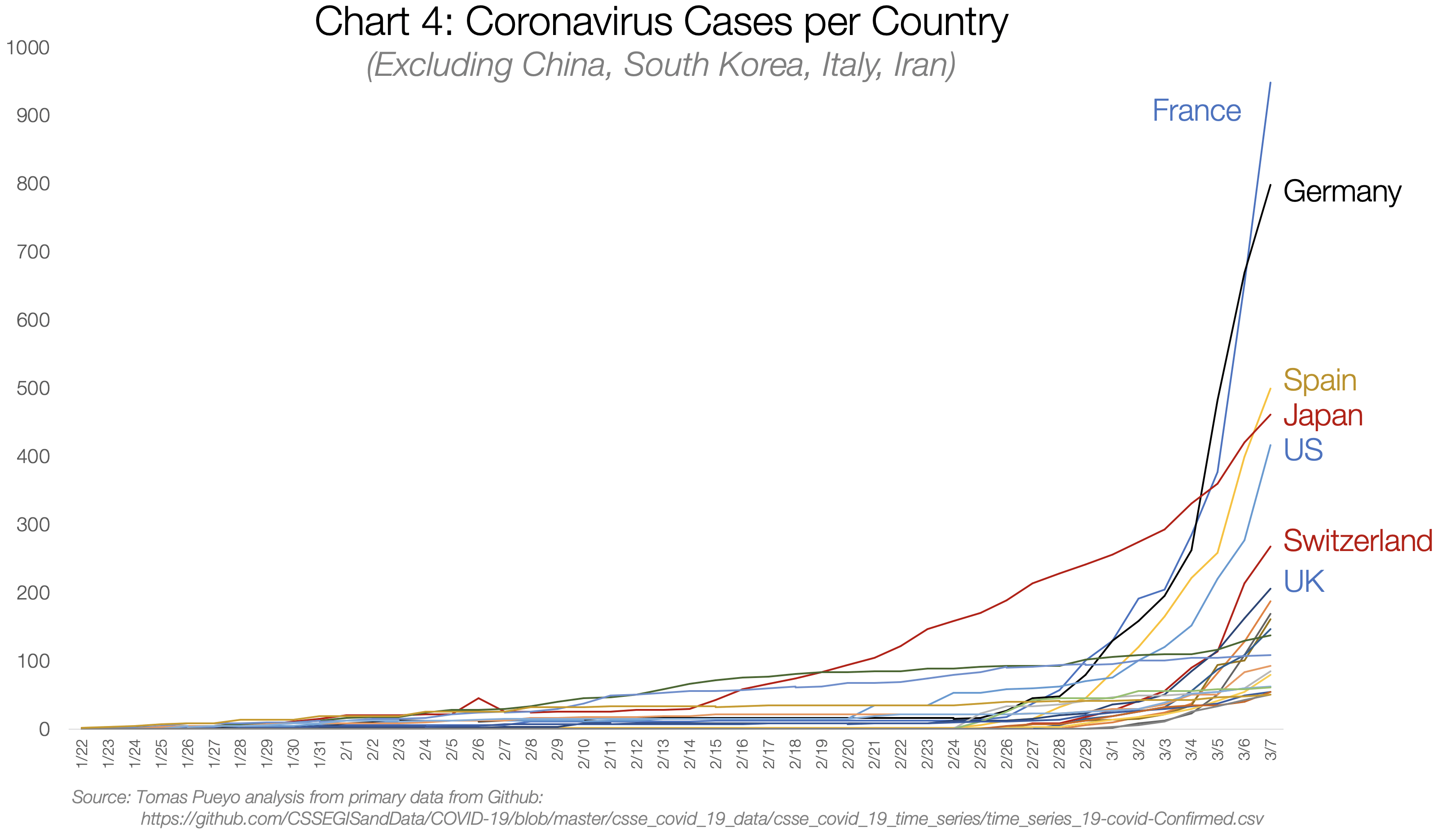 Avant de passer à eux, une note sur la Corée du Sud : le pays est probablement une valeur aberrante. Le coronavirus était contenu pour les 30 premiers cas. Le patient 31 était un super-contaminateur qui l’a transmis à des milliers d’autres personnes. Parce que le virus se propage avant que les gens ne présentent des symptômes, au moment où les autorités ont pris conscience du problème, le virus était déjà là. Elles paient maintenant les conséquences de cette seule instance. Cependant, leurs efforts de confinement commencent à payer : l’Italie l’a déjà surpassée en nombre de cas, et l’Iran le fera demain (10 mars 2020).