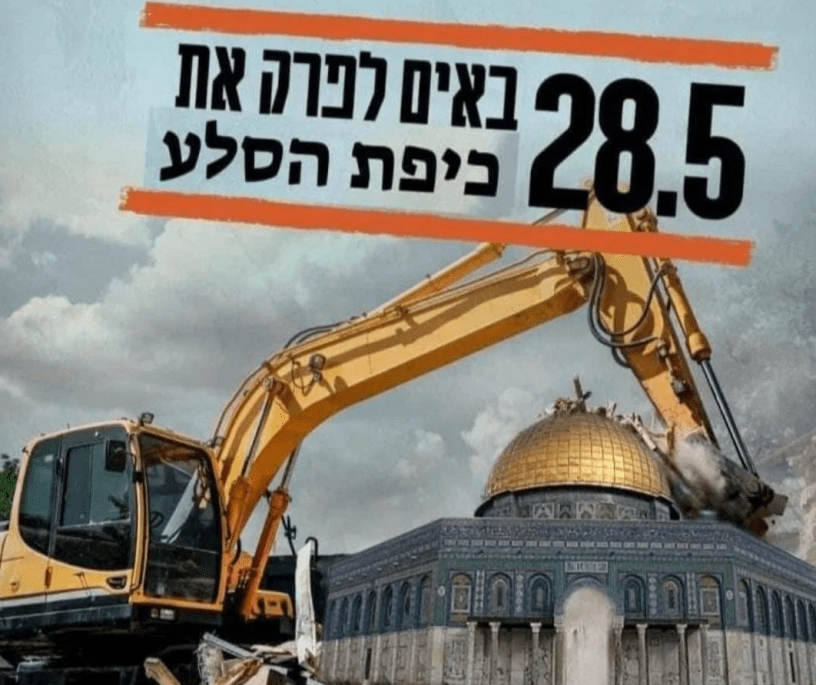 Le groupe Lehava a publié une affiche sur les réseaux sociaux montrant une pelleteuse près du dôme du Rocher. Sur une autre affiche, une pelleteuse semble déblayer les ruines de la mosquée.