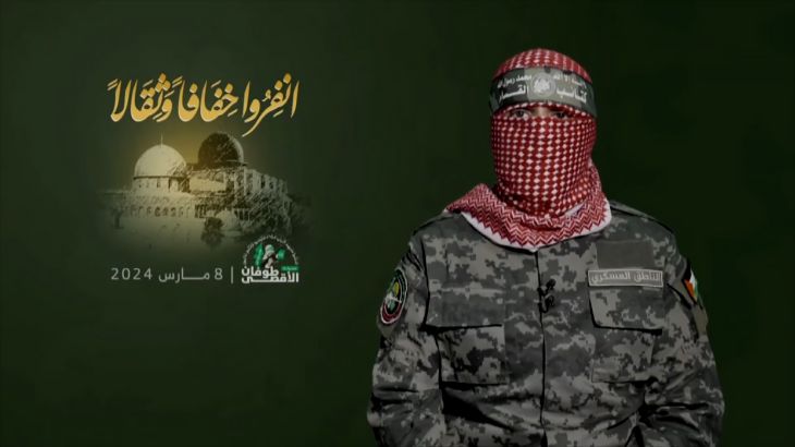 Discours d’Abu Obeida, porte-parole des Brigades du Martyr Izz El-Din Al-Qassam, branche armée du Hamas, le 8 mars 2024.