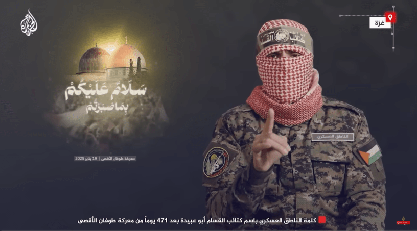 Discours d’Abu Obeida, porte-parole des Brigades du martyr Izz El-Din Al-Qassam, la branche armée du Hamas, suite à l’accord de cessez-le-feu à Gaza, le 19 janvier 2025.