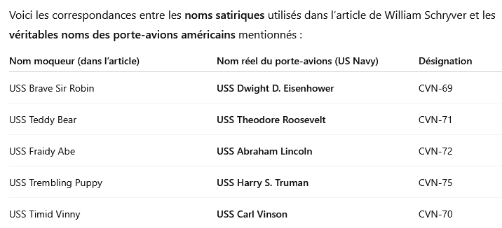 En 2024 déjà, l’USS Brave Sir Robin (CVN-69), l’USS Teddy Bear (CVN-71) et l’USS Fraidy Abe (CVN-72) s’y étaient essayés, pour finalement battre en retraite, la queue entre les jambes. Le Brave Sir Robin a laissé au fond de la mer un F/A-18.