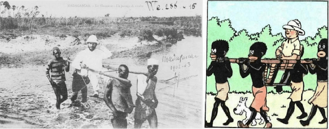 En filanzane de Madagascar au Congo : « L’Homme Blanc ne rechigne pas à porter son fardeau, selon l’expression de Kipling ; il travaille avec zèle à l’élévation des peuples de couleur. » (Pierre Deschamps[12])